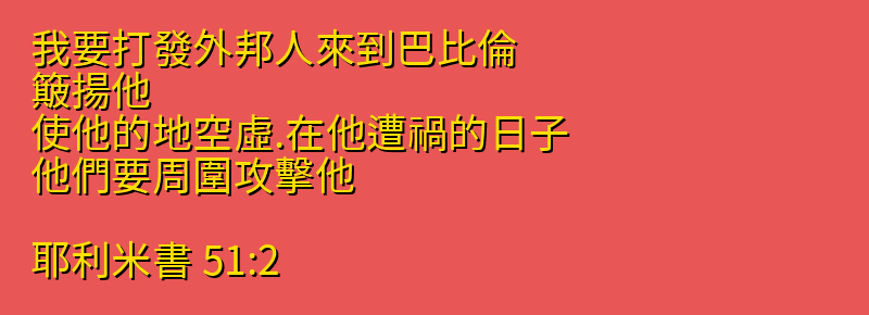 51:2 我要打發外邦人來到巴比倫、簸揚他、使他的地空虛.在他遭禍的日子、他們要周圍攻擊他。51:3 拉弓的、要向拉弓的和貫甲挺身的射箭.不要憐惜他的少年人.要滅盡他的全軍。51:4 他們必在迦勒底人之地、被殺仆倒、在巴比倫的街上被刺透。51:5 以色列和猶大、雖然境內充滿違背以色列聖者的罪、卻沒有被他的 神萬軍之耶和華丟棄。51:6 你們要從巴比倫中逃奔、各救自己的性命.不要陷在他的罪孽中、一同滅亡、因為這是耶和華報仇的時候.他必向巴比倫施行報應。51:7 巴比倫素來是耶和華手中的金杯、使天下沉醉.萬國喝了他的酒就顛狂了。51:8 巴比倫忽然傾覆毀壞.要為他哀號、為止他的疼痛、拿乳香、或者可以治好。51:9 我們想醫治巴比倫、他卻沒有治好.離開他罷、我們各人歸回本國.因為他受的審判通於上天、達到穹蒼。51:10 耶和華已經彰顯我們的公義.來罷、我們可以在錫安報告耶和華我們 神的作為。51:11 你們要磨尖了箭頭、抓住盾牌.耶和華定意攻擊巴比倫、將他毀滅、所以激動了瑪代君王的心、因這是耶和華報仇、就是為自己的殿報仇。51:12 你們要豎立大旗、攻擊巴比倫的城牆.要堅固瞭望臺、派定守望的設下埋伏.因為耶和華指著巴比倫居民所說的話、所定的意、他已經作成。51:13 住在眾水之上多有財寶的阿、你的結局到了、你貪婪之量滿了。51:14 萬軍之耶和華指著自己起誓、說、我必使敵人充滿你、像螞蚱一樣.他們必吶喊攻擊你。51:15 耶和華用能力創造大地、用智慧建立世界、用聰明鋪張穹蒼。51:16 他一發聲、空中便有多水激動.他使雲霧從地極上騰.他造電隨雨而閃、從他府庫中帶出風來。51:17 各人都成了畜類、毫無知識.各銀匠都因他的偶像羞愧.他所鑄的偶像、本是虛假的、其中並無氣息.51:18 都是虛無的、是迷惑人的工作.到追討的時候、必被除滅。51:19 雅各的分不像這些.因他是造作萬有的主.以色列也是他產業的支派.萬軍之耶和華是他的名。51:20 你是我爭戰的斧子、和打仗的兵器.我要用你打碎列國、用你毀滅列邦.51:21 用你打碎馬和騎馬的.用你打碎戰車和坐在其上的.51:22 用你打碎男人和女人.用你打碎老年人和少年人.用你打碎壯丁和處女.51:23 用你打碎牧人和他的群畜.用你打碎農夫和他一對牛.用你打碎省長和副省長。51:24 耶和華說、我必在你們眼前報復巴比倫人和迦勒底居民在錫安所行的諸惡。51:25 耶和華說、你這行毀滅的山哪、就是毀滅天下的山、我與你反對.我必向你伸手、將你從山巖滾下去、使你成為燒燬的山。51:26 人必不從你那裡取石頭為房角石、也不取石頭為根基石.你必永遠荒涼.這是耶和華說的。51:27 要在境內豎立大旗、在各國中吹角、使列國預備攻擊巴比倫、將亞拉臘、米尼、亞實基拿各國招來攻擊他.又派軍長來攻擊他、使馬匹上來如螞蚱.51:28 使列國和瑪代君王、與省長、和副省長、並他們所管全地之人、都預備攻擊他。51:29 地必震動而瘠苦.因耶和華向巴比倫所定的旨意成立了、使巴比倫之地荒涼、無人居住。51:30 巴比倫的勇士止息爭戰、藏在堅壘之中.他們的勇力衰盡、好像婦女一樣.巴比倫的住處有火冲起.門閂都折斷了。51:31 通報的要彼此相遇、送信的要互相迎接、報告巴比倫王、說、城的四方、被攻取了.51:32 渡口被佔據了、葦塘被火燒了、兵丁也驚慌了。51:33 萬軍之耶和華以色列的 神如此說、巴比倫城、〔城原文作女子〕好像踹榖的禾場.再過片時、收割他的時候就到了。51:34 以色列人說、巴比倫王尼布甲尼撒吞滅我、壓碎我、使我成為空虛的器皿.他像大魚、將我吞下、用我的美物充滿他的肚腹、又將我趕出去。51:35 錫安的居民要說、巴比倫以強暴待我、損害我的身體.願這罪歸給他.耶路撒冷人要說、願流我們血的罪、歸到迦勒底的居民。51:36 所以耶和華如此說、我必為你伸冤、為你報仇.我必使巴比倫的海枯竭、使他的泉源乾涸。51:37 巴比倫必成為亂堆、為野狗的住處、令人驚駭、嗤笑、並且無人居住。51:38 他們要像少壯獅子咆哮、像小獅子吼叫。51:39 他們火熱的時候、我必為他們設擺酒席、使他們沉醉、好叫他們快樂、睡了長覺、永不醒起.這是耶和華說的。51:40 我必使他們像羊羔、像公綿羊和公山羊、下到宰殺之地。51:41 示沙克〔就是巴比倫〕何竟被攻取.天下所稱讚的、何竟被佔據.巴比倫在列國中、何竟變為荒場。51:42 海水漲起、漫過巴比倫.他被許多海浪遮蓋。51:43 他的城邑、變為荒場、旱地、沙漠、無人居住、無人經過之地。51:44 我必刑罰巴比倫的彼勒、使他吐出所吞的.萬民必不再流歸他那裡、巴比倫的城牆、也必坍塌了。51:45 我的民哪、你們要從其中出去、各人拯救自己、躲避耶和華的烈怒。51:46 你們不要心驚膽怯、也不要因境內所聽見的風聲懼怕.因為這年有風聲傳來、那年也有風聲傳來、境內有強暴的事、官長攻擊官長。51:47 日子將到、我必刑罰巴比倫雕刻的偶像.他全地必然抱愧.他被殺的人、必在其中仆倒。51:48 那時、天地和其中所有的、必因巴比倫歡呼.因為行毀滅的、要從北方來到他那裡.這是耶和華說的。51:49 巴比倫怎樣使以色列被殺的人仆倒、照樣他全地被殺的人、也必在巴比倫仆倒。51:50 你們躲避刀劍的要快走、不要站住.要在遠方記念耶和華、心中追想耶路撒冷。51:51 我們聽見辱罵就蒙羞、滿面