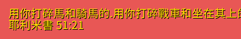 51:2 我要打發外邦人來到巴比倫、簸揚他、使他的地空虛.在他遭禍的日子、他們要周圍攻擊他。51:3 拉弓的、要向拉弓的和貫甲挺身的射箭.不要憐惜他的少年人.要滅盡他的全軍。51:4 他們必在迦勒底人之地、被殺仆倒、在巴比倫的街上被刺透。51:5 以色列和猶大、雖然境內充滿違背以色列聖者的罪、卻沒有被他的 神萬軍之耶和華丟棄。51:6 你們要從巴比倫中逃奔、各救自己的性命.不要陷在他的罪孽中、一同滅亡、因為這是耶和華報仇的時候.他必向巴比倫施行報應。51:7 巴比倫素來是耶和華手中的金杯、使天下沉醉.萬國喝了他的酒就顛狂了。51:8 巴比倫忽然傾覆毀壞.要為他哀號、為止他的疼痛、拿乳香、或者可以治好。51:9 我們想醫治巴比倫、他卻沒有治好.離開他罷、我們各人歸回本國.因為他受的審判通於上天、達到穹蒼。51:10 耶和華已經彰顯我們的公義.來罷、我們可以在錫安報告耶和華我們 神的作為。51:11 你們要磨尖了箭頭、抓住盾牌.耶和華定意攻擊巴比倫、將他毀滅、所以激動了瑪代君王的心、因這是耶和華報仇、就是為自己的殿報仇。51:12 你們要豎立大旗、攻擊巴比倫的城牆.要堅固瞭望臺、派定守望的設下埋伏.因為耶和華指著巴比倫居民所說的話、所定的意、他已經作成。51:13 住在眾水之上多有財寶的阿、你的結局到了、你貪婪之量滿了。51:14 萬軍之耶和華指著自己起誓、說、我必使敵人充滿你、像螞蚱一樣.他們必吶喊攻擊你。51:15 耶和華用能力創造大地、用智慧建立世界、用聰明鋪張穹蒼。51:16 他一發聲、空中便有多水激動.他使雲霧從地極上騰.他造電隨雨而閃、從他府庫中帶出風來。51:17 各人都成了畜類、毫無知識.各銀匠都因他的偶像羞愧.他所鑄的偶像、本是虛假的、其中並無氣息.51:18 都是虛無的、是迷惑人的工作.到追討的時候、必被除滅。51:19 雅各的分不像這些.因他是造作萬有的主.以色列也是他產業的支派.萬軍之耶和華是他的名。51:20 你是我爭戰的斧子、和打仗的兵器.我要用你打碎列國、用你毀滅列邦.51:21 用你打碎馬和騎馬的.用你打碎戰車和坐在其上的.51:22 用你打碎男人和女人.用你打碎老年人和少年人.用你打碎壯丁和處女.51:23 用你打碎牧人和他的群畜.用你打碎農夫和他一對牛.用你打碎省長和副省長。51:24 耶和華說、我必在你們眼前報復巴比倫人和迦勒底居民在錫安所行的諸惡。51:25 耶和華說、你這行毀滅的山哪、就是毀滅天下的山、我與你反對.我必向你伸手、將你從山巖滾下去、使你成為燒燬的山。51:26 人必不從你那裡取石頭為房角石、也不取石頭為根基石.你必永遠荒涼.這是耶和華說的。51:27 要在境內豎立大旗、在各國中吹角、使列國預備攻擊巴比倫、將亞拉臘、米尼、亞實基拿各國招來攻擊他.又派軍長來攻擊他、使馬匹上來如螞蚱.51:28 使列國和瑪代君王、與省長、和副省長、並他們所管全地之人、都預備攻擊他。51:29 地必震動而瘠苦.因耶和華向巴比倫所定的旨意成立了、使巴比倫之地荒涼、無人居住。51:30 巴比倫的勇士止息爭戰、藏在堅壘之中.他們的勇力衰盡、好像婦女一樣.巴比倫的住處有火冲起.門閂都折斷了。51:31 通報的要彼此相遇、送信的要互相迎接、報告巴比倫王、說、城的四方、被攻取了.51:32 渡口被佔據了、葦塘被火燒了、兵丁也驚慌了。51:33 萬軍之耶和華以色列的 神如此說、巴比倫城、〔城原文作女子〕好像踹榖的禾場.再過片時、收割他的時候就到了。51:34 以色列人說、巴比倫王尼布甲尼撒吞滅我、壓碎我、使我成為空虛的器皿.他像大魚、將我吞下、用我的美物充滿他的肚腹、又將我趕出去。51:35 錫安的居民要說、巴比倫以強暴待我、損害我的身體.願這罪歸給他.耶路撒冷人要說、願流我們血的罪、歸到迦勒底的居民。51:36 所以耶和華如此說、我必為你伸冤、為你報仇.我必使巴比倫的海枯竭、使他的泉源乾涸。51:37 巴比倫必成為亂堆、為野狗的住處、令人驚駭、嗤笑、並且無人居住。51:38 他們要像少壯獅子咆哮、像小獅子吼叫。51:39 他們火熱的時候、我必為他們設擺酒席、使他們沉醉、好叫他們快樂、睡了長覺、永不醒起.這是耶和華說的。51:40 我必使他們像羊羔、像公綿羊和公山羊、下到宰殺之地。51:41 示沙克〔就是巴比倫〕何竟被攻取.天下所稱讚的、何竟被佔據.巴比倫在列國中、何竟變為荒場。51:42 海水漲起、漫過巴比倫.他被許多海浪遮蓋。51:43 他的城邑、變為荒場、旱地、沙漠、無人居住、無人經過之地。51:44 我必刑罰巴比倫的彼勒、使他吐出所吞的.萬民必不再流歸他那裡、巴比倫的城牆、也必坍塌了。51:45 我的民哪、你們要從其中出去、各人拯救自己、躲避耶和華的烈怒。51:46 你們不要心驚膽怯、也不要因境內所聽見的風聲懼怕.因為這年有風聲傳來、那年也有風聲傳來、境內有強暴的事、官長攻擊官長。51:47 日子將到、我必刑罰巴比倫雕刻的偶像.他全地必然抱愧.他被殺的人、必在其中仆倒。51:48 那時、天地和其中所有的、必因巴比倫歡呼.因為行毀滅的、要從北方來到他那裡.這是耶和華說的。51:49 巴比倫怎樣使以色列被殺的人仆倒、照樣他全地被殺的人、也必在巴比倫仆倒。51:50 你們躲避刀劍的要快走、不要站住.要在遠方記念耶和華、心中追想耶路撒冷。51:51 我們聽見辱罵就蒙羞、滿面