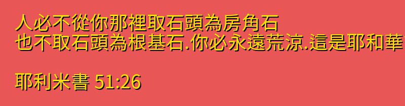 人必不從你那裡取石頭為房角石、也不取石頭為根基石.你必永遠荒涼.這是耶和華說的。