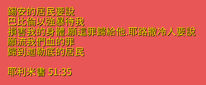 • 51:35 錫安的居民要說、巴比倫以強暴待我、損害我的身體.願這罪歸給他.耶路撒冷人要說、願流我們血的罪、歸到迦勒底的居民。