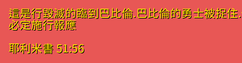 51:2 我要打發外邦人來到巴比倫、簸揚他、使他的地空虛.在他遭禍的日子、他們要周圍攻擊他。51:3 拉弓的、要向拉弓的和貫甲挺身的射箭.不要憐惜他的少年人.要滅盡他的全軍。51:4 他們必在迦勒底人之地、被殺仆倒、在巴比倫的街上被刺透。51:5 以色列和猶大、雖然境內充滿違背以色列聖者的罪、卻沒有被他的 神萬軍之耶和華丟棄。51:6 你們要從巴比倫中逃奔、各救自己的性命.不要陷在他的罪孽中、一同滅亡、因為這是耶和華報仇的時候.他必向巴比倫施行報應。51:7 巴比倫素來是耶和華手中的金杯、使天下沉醉.萬國喝了他的酒就顛狂了。51:8 巴比倫忽然傾覆毀壞.要為他哀號、為止他的疼痛、拿乳香、或者可以治好。51:9 我們想醫治巴比倫、他卻沒有治好.離開他罷、我們各人歸回本國.因為他受的審判通於上天、達到穹蒼。51:10 耶和華已經彰顯我們的公義.來罷、我們可以在錫安報告耶和華我們 神的作為。51:11 你們要磨尖了箭頭、抓住盾牌.耶和華定意攻擊巴比倫、將他毀滅、所以激動了瑪代君王的心、因這是耶和華報仇、就是為自己的殿報仇。51:12 你們要豎立大旗、攻擊巴比倫的城牆.要堅固瞭望臺、派定守望的設下埋伏.因為耶和華指著巴比倫居民所說的話、所定的意、他已經作成。51:13 住在眾水之上多有財寶的阿、你的結局到了、你貪婪之量滿了。51:14 萬軍之耶和華指著自己起誓、說、我必使敵人充滿你、像螞蚱一樣.他們必吶喊攻擊你。51:15 耶和華用能力創造大地、用智慧建立世界、用聰明鋪張穹蒼。51:16 他一發聲、空中便有多水激動.他使雲霧從地極上騰.他造電隨雨而閃、從他府庫中帶出風來。51:17 各人都成了畜類、毫無知識.各銀匠都因他的偶像羞愧.他所鑄的偶像、本是虛假的、其中並無氣息.51:18 都是虛無的、是迷惑人的工作.到追討的時候、必被除滅。51:19 雅各的分不像這些.因他是造作萬有的主.以色列也是他產業的支派.萬軍之耶和華是他的名。51:20 你是我爭戰的斧子、和打仗的兵器.我要用你打碎列國、用你毀滅列邦.51:21 用你打碎馬和騎馬的.用你打碎戰車和坐在其上的.51:22 用你打碎男人和女人.用你打碎老年人和少年人.用你打碎壯丁和處女.51:23 用你打碎牧人和他的群畜.用你打碎農夫和他一對牛.用你打碎省長和副省長。51:24 耶和華說、我必在你們眼前報復巴比倫人和迦勒底居民在錫安所行的諸惡。51:25 耶和華說、你這行毀滅的山哪、就是毀滅天下的山、我與你反對.我必向你伸手、將你從山巖滾下去、使你成為燒燬的山。51:26 人必不從你那裡取石頭為房角石、也不取石頭為根基石.你必永遠荒涼.這是耶和華說的。51:27 要在境內豎立大旗、在各國中吹角、使列國預備攻擊巴比倫、將亞拉臘、米尼、亞實基拿各國招來攻擊他.又派軍長來攻擊他、使馬匹上來如螞蚱.51:28 使列國和瑪代君王、與省長、和副省長、並他們所管全地之人、都預備攻擊他。51:29 地必震動而瘠苦.因耶和華向巴比倫所定的旨意成立了、使巴比倫之地荒涼、無人居住。51:30 巴比倫的勇士止息爭戰、藏在堅壘之中.他們的勇力衰盡、好像婦女一樣.巴比倫的住處有火冲起.門閂都折斷了。51:31 通報的要彼此相遇、送信的要互相迎接、報告巴比倫王、說、城的四方、被攻取了.51:32 渡口被佔據了、葦塘被火燒了、兵丁也驚慌了。51:33 萬軍之耶和華以色列的 神如此說、巴比倫城、〔城原文作女子〕好像踹榖的禾場.再過片時、收割他的時候就到了。51:34 以色列人說、巴比倫王尼布甲尼撒吞滅我、壓碎我、使我成為空虛的器皿.他像大魚、將我吞下、用我的美物充滿他的肚腹、又將我趕出去。51:35 錫安的居民要說、巴比倫以強暴待我、損害我的身體.願這罪歸給他.耶路撒冷人要說、願流我們血的罪、歸到迦勒底的居民。51:36 所以耶和華如此說、我必為你伸冤、為你報仇.我必使巴比倫的海枯竭、使他的泉源乾涸。51:37 巴比倫必成為亂堆、為野狗的住處、令人驚駭、嗤笑、並且無人居住。51:38 他們要像少壯獅子咆哮、像小獅子吼叫。51:39 他們火熱的時候、我必為他們設擺酒席、使他們沉醉、好叫他們快樂、睡了長覺、永不醒起.這是耶和華說的。51:40 我必使他們像羊羔、像公綿羊和公山羊、下到宰殺之地。51:41 示沙克〔就是巴比倫〕何竟被攻取.天下所稱讚的、何竟被佔據.巴比倫在列國中、何竟變為荒場。51:42 海水漲起、漫過巴比倫.他被許多海浪遮蓋。51:43 他的城邑、變為荒場、旱地、沙漠、無人居住、無人經過之地。51:44 我必刑罰巴比倫的彼勒、使他吐出所吞的.萬民必不再流歸他那裡、巴比倫的城牆、也必坍塌了。51:45 我的民哪、你們要從其中出去、各人拯救自己、躲避耶和華的烈怒。51:46 你們不要心驚膽怯、也不要因境內所聽見的風聲懼怕.因為這年有風聲傳來、那年也有風聲傳來、境內有強暴的事、官長攻擊官長。51:47 日子將到、我必刑罰巴比倫雕刻的偶像.他全地必然抱愧.他被殺的人、必在其中仆倒。51:48 那時、天地和其中所有的、必因巴比倫歡呼.因為行毀滅的、要從北方來到他那裡.這是耶和華說的。51:49 巴比倫怎樣使以色列被殺的人仆倒、照樣他全地被殺的人、也必在巴比倫仆倒。51:50 你們躲避刀劍的要快走、不要站住.要在遠方記念耶和華、心中追想耶路撒冷。51:51 我們聽見辱罵就蒙羞、滿面