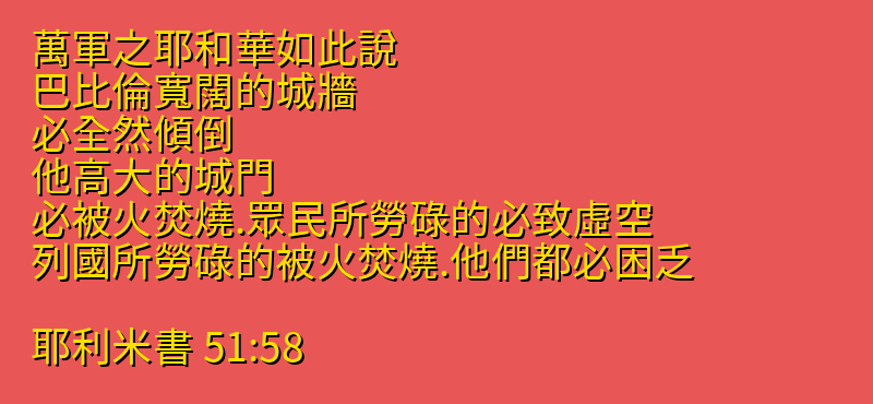 • 51:58 萬軍之耶和華如此說、巴比倫寬闊的城牆、必全然傾倒、他高大的城門、必被火焚燒.眾民所勞碌的必致虛空、列國所勞碌的被火焚燒.他們都必困乏。