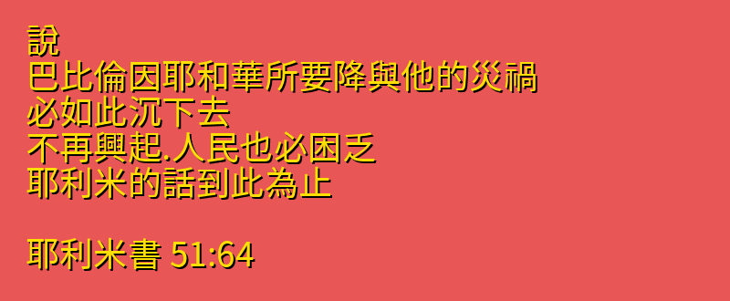51:2 我要打發外邦人來到巴比倫、簸揚他、使他的地空虛.在他遭禍的日子、他們要周圍攻擊他。51:3 拉弓的、要向拉弓的和貫甲挺身的射箭.不要憐惜他的少年人.要滅盡他的全軍。51:4 他們必在迦勒底人之地、被殺仆倒、在巴比倫的街上被刺透。51:5 以色列和猶大、雖然境內充滿違背以色列聖者的罪、卻沒有被他的 神萬軍之耶和華丟棄。51:6 你們要從巴比倫中逃奔、各救自己的性命.不要陷在他的罪孽中、一同滅亡、因為這是耶和華報仇的時候.他必向巴比倫施行報應。51:7 巴比倫素來是耶和華手中的金杯、使天下沉醉.萬國喝了他的酒就顛狂了。51:8 巴比倫忽然傾覆毀壞.要為他哀號、為止他的疼痛、拿乳香、或者可以治好。51:9 我們想醫治巴比倫、他卻沒有治好.離開他罷、我們各人歸回本國.因為他受的審判通於上天、達到穹蒼。51:10 耶和華已經彰顯我們的公義.來罷、我們可以在錫安報告耶和華我們 神的作為。51:11 你們要磨尖了箭頭、抓住盾牌.耶和華定意攻擊巴比倫、將他毀滅、所以激動了瑪代君王的心、因這是耶和華報仇、就是為自己的殿報仇。51:12 你們要豎立大旗、攻擊巴比倫的城牆.要堅固瞭望臺、派定守望的設下埋伏.因為耶和華指著巴比倫居民所說的話、所定的意、他已經作成。51:13 住在眾水之上多有財寶的阿、你的結局到了、你貪婪之量滿了。51:14 萬軍之耶和華指著自己起誓、說、我必使敵人充滿你、像螞蚱一樣.他們必吶喊攻擊你。51:15 耶和華用能力創造大地、用智慧建立世界、用聰明鋪張穹蒼。51:16 他一發聲、空中便有多水激動.他使雲霧從地極上騰.他造電隨雨而閃、從他府庫中帶出風來。51:17 各人都成了畜類、毫無知識.各銀匠都因他的偶像羞愧.他所鑄的偶像、本是虛假的、其中並無氣息.51:18 都是虛無的、是迷惑人的工作.到追討的時候、必被除滅。51:19 雅各的分不像這些.因他是造作萬有的主.以色列也是他產業的支派.萬軍之耶和華是他的名。51:20 你是我爭戰的斧子、和打仗的兵器.我要用你打碎列國、用你毀滅列邦.51:21 用你打碎馬和騎馬的.用你打碎戰車和坐在其上的.51:22 用你打碎男人和女人.用你打碎老年人和少年人.用你打碎壯丁和處女.51:23 用你打碎牧人和他的群畜.用你打碎農夫和他一對牛.用你打碎省長和副省長。51:24 耶和華說、我必在你們眼前報復巴比倫人和迦勒底居民在錫安所行的諸惡。51:25 耶和華說、你這行毀滅的山哪、就是毀滅天下的山、我與你反對.我必向你伸手、將你從山巖滾下去、使你成為燒燬的山。51:26 人必不從你那裡取石頭為房角石、也不取石頭為根基石.你必永遠荒涼.這是耶和華說的。51:27 要在境內豎立大旗、在各國中吹角、使列國預備攻擊巴比倫、將亞拉臘、米尼、亞實基拿各國招來攻擊他.又派軍長來攻擊他、使馬匹上來如螞蚱.51:28 使列國和瑪代君王、與省長、和副省長、並他們所管全地之人、都預備攻擊他。51:29 地必震動而瘠苦.因耶和華向巴比倫所定的旨意成立了、使巴比倫之地荒涼、無人居住。51:30 巴比倫的勇士止息爭戰、藏在堅壘之中.他們的勇力衰盡、好像婦女一樣.巴比倫的住處有火冲起.門閂都折斷了。51:31 通報的要彼此相遇、送信的要互相迎接、報告巴比倫王、說、城的四方、被攻取了.51:32 渡口被佔據了、葦塘被火燒了、兵丁也驚慌了。51:33 萬軍之耶和華以色列的 神如此說、巴比倫城、〔城原文作女子〕好像踹榖的禾場.再過片時、收割他的時候就到了。51:34 以色列人說、巴比倫王尼布甲尼撒吞滅我、壓碎我、使我成為空虛的器皿.他像大魚、將我吞下、用我的美物充滿他的肚腹、又將我趕出去。51:35 錫安的居民要說、巴比倫以強暴待我、損害我的身體.願這罪歸給他.耶路撒冷人要說、願流我們血的罪、歸到迦勒底的居民。51:36 所以耶和華如此說、我必為你伸冤、為你報仇.我必使巴比倫的海枯竭、使他的泉源乾涸。51:37 巴比倫必成為亂堆、為野狗的住處、令人驚駭、嗤笑、並且無人居住。51:38 他們要像少壯獅子咆哮、像小獅子吼叫。51:39 他們火熱的時候、我必為他們設擺酒席、使他們沉醉、好叫他們快樂、睡了長覺、永不醒起.這是耶和華說的。51:40 我必使他們像羊羔、像公綿羊和公山羊、下到宰殺之地。51:41 示沙克〔就是巴比倫〕何竟被攻取.天下所稱讚的、何竟被佔據.巴比倫在列國中、何竟變為荒場。51:42 海水漲起、漫過巴比倫.他被許多海浪遮蓋。51:43 他的城邑、變為荒場、旱地、沙漠、無人居住、無人經過之地。51:44 我必刑罰巴比倫的彼勒、使他吐出所吞的.萬民必不再流歸他那裡、巴比倫的城牆、也必坍塌了。51:45 我的民哪、你們要從其中出去、各人拯救自己、躲避耶和華的烈怒。51:46 你們不要心驚膽怯、也不要因境內所聽見的風聲懼怕.因為這年有風聲傳來、那年也有風聲傳來、境內有強暴的事、官長攻擊官長。51:47 日子將到、我必刑罰巴比倫雕刻的偶像.他全地必然抱愧.他被殺的人、必在其中仆倒。51:48 那時、天地和其中所有的、必因巴比倫歡呼.因為行毀滅的、要從北方來到他那裡.這是耶和華說的。51:49 巴比倫怎樣使以色列被殺的人仆倒、照樣他全地被殺的人、也必在巴比倫仆倒。51:50 你們躲避刀劍的要快走、不要站住.要在遠方記念耶和華、心中追想耶路撒冷。51:51 我們聽見辱罵就蒙羞、滿面