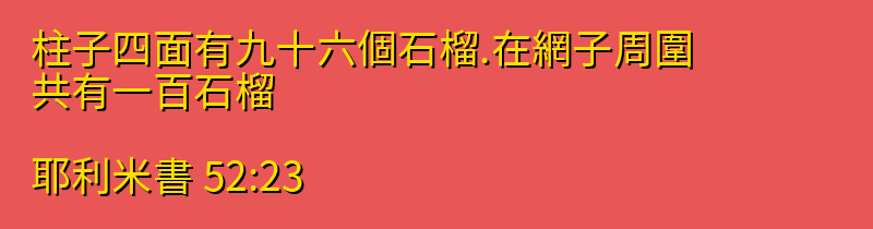 今日分享的中文聖經:「柱子四面有九十六個石榴.在網子周圍、共有一百石榴。」來自聖經「耶利米書」第「52章23節」,你可以繼續向下拉看到聖經卷書完整章節。每日中文聖經從神的話語中聆聽神的聲音,引導我們的人生,指導我們人生的方向,讓我們做出正確的選擇,而做出這些正確選擇的原則都在聖經中,所以我們需要讀神的話語,認識他的話語,把神的話語藏在心裡。