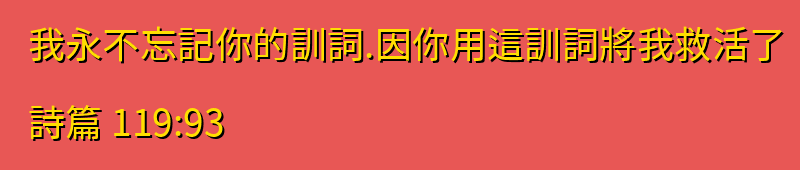 今日分享的中文聖經:「我永不忘記你的訓詞.因你用這訓詞將我救活了。」來自聖經「詩篇」第「119章93節」,你可以繼續向下拉看到聖經卷書完整章節。每日中文聖經從神的話語中聆聽神的聲音,引導我們的人生,指導我們人生的方向,讓我們做出正確的選擇,而做出這些正確選擇的原則都在聖經中,所以我們需要讀神的話語,認識他的話語,把神的話語藏在心裡。