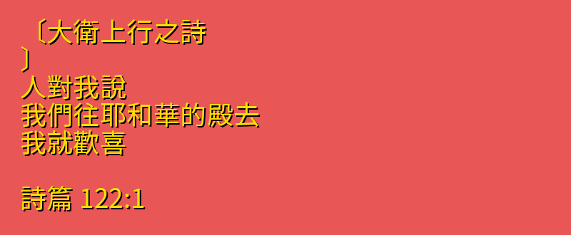 - 122:1 〔大衛上行之詩。〕人對我說、我們往耶和華的殿去、我就歡喜。