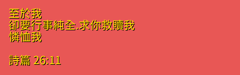 今日分享的中文聖經:「至於我、卻要行事純全.求你救贖我、憐恤我。」來自聖經「詩篇」第「26章11節」,你可以繼續向下拉看到聖經卷書完整章節。每日中文聖經從神的話語中聆聽神的聲音,引導我們的人生,指導我們人生的方向,讓我們做出正確的選擇,而做出這些正確選擇的原則都在聖經中,所以我們需要讀神的話語,認識他的話語,把神的話語藏在心裡。