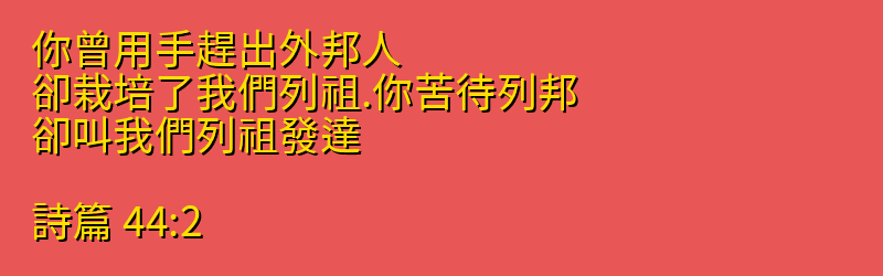 今日分享的中文聖經:「你曾用手趕出外邦人、卻栽培了我們列祖.你苦待列邦、卻叫我們列祖發達。」來自聖經「詩篇」第「44章2節」,你可以繼續向下拉看到聖經卷書完整章節。每日中文聖經從神的話語中聆聽神的聲音,引導我們的人生,指導我們人生的方向,讓我們做出正確的選擇,而做出這些正確選擇的原則都在聖經中,所以我們需要讀神的話語,認識他的話語,把神的話語藏在心裡。