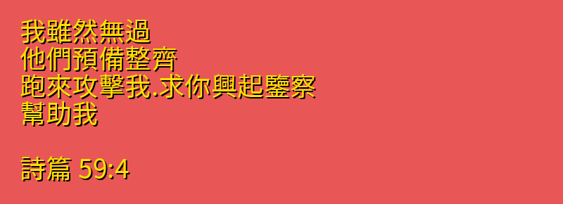 今日分享的中文聖經:「我雖然無過、他們預備整齊、跑來攻擊我.求你興起鑒察、幫助我。」來自聖經「詩篇」第「59章4節」,你可以繼續向下拉看到聖經卷書完整章節。每日中文聖經從神的話語中聆聽神的聲音,引導我們的人生,指導我們人生的方向,讓我們做出正確的選擇,而做出這些正確選擇的原則都在聖經中,所以我們需要讀神的話語,認識他的話語,把神的話語藏在心裡。