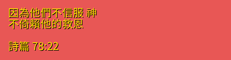 今日分享的中文聖經:「因為他們不信服 神、不倚賴他的救恩。」來自聖經「詩篇」第「78章22節」,你可以繼續向下拉看到聖經卷書完整章節。每日中文聖經從神的話語中聆聽神的聲音,引導我們的人生,指導我們人生的方向,讓我們做出正確的選擇,而做出這些正確選擇的原則都在聖經中,所以我們需要讀神的話語,認識他的話語,把神的話語藏在心裡。