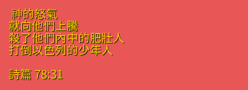 今日分享的中文聖經:「 神的怒氣、就向他們上騰、殺了他們內中的肥壯人、打倒以色列的少年人。」來自聖經「詩篇」第「78章31節」,你可以繼續向下拉看到聖經卷書完整章節。每日中文聖經從神的話語中聆聽神的聲音,引導我們的人生,指導我們人生的方向,讓我們做出正確的選擇,而做出這些正確選擇的原則都在聖經中,所以我們需要讀神的話語,認識他的話語,把神的話語藏在心裡。