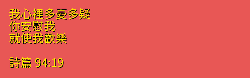 今日分享的中文聖經:「我心裡多憂多疑、你安慰我、就使我歡樂。」來自聖經「詩篇」第「94章19節」,你可以繼續向下拉看到聖經卷書完整章節。每日中文聖經從神的話語中聆聽神的聲音,引導我們的人生,指導我們人生的方向,讓我們做出正確的選擇,而做出這些正確選擇的原則都在聖經中,所以我們需要讀神的話語,認識他的話語,把神的話語藏在心裡。