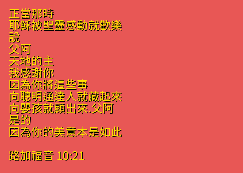 正當那時、耶穌被聖靈感動就歡樂、說、父阿、天地的主、我感謝你、因為你將這些事、向聰明通達人就藏起來、向嬰孩就顯出來.父阿、是的、因為你的美意本是如此。