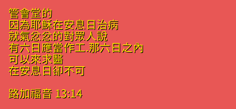今日分享的中文聖經:「管會堂的、因為耶穌在安息日治病、就氣忿忿的對眾人說、有六日應當作工.那六日之內、可以來求醫、在安息日卻不可。」來自聖經「路加福音」第「13章14節」,你可以繼續向下拉看到聖經卷書完整章節。每日中文聖經從神的話語中聆聽神的聲音,引導我們的人生,指導我們人生的方向,讓我們做出正確的選擇,而做出這些正確選擇的原則都在聖經中,所以我們需要讀神的話語,認識他的話語,把神的話語藏在心裡。