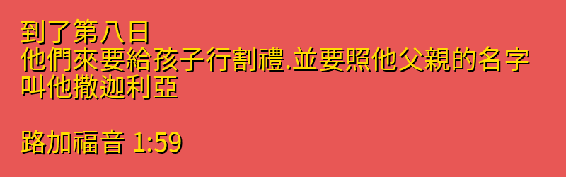 今日分享的中文聖經:「到了第八日、他們來要給孩子行割禮.並要照他父親的名字、叫他撒迦利亞。」來自聖經「路加福音」第「1章59節」,你可以繼續向下拉看到聖經卷書完整章節。每日中文聖經從神的話語中聆聽神的聲音,引導我們的人生,指導我們人生的方向,讓我們做出正確的選擇,而做出這些正確選擇的原則都在聖經中,所以我們需要讀神的話語,認識他的話語,把神的話語藏在心裡。