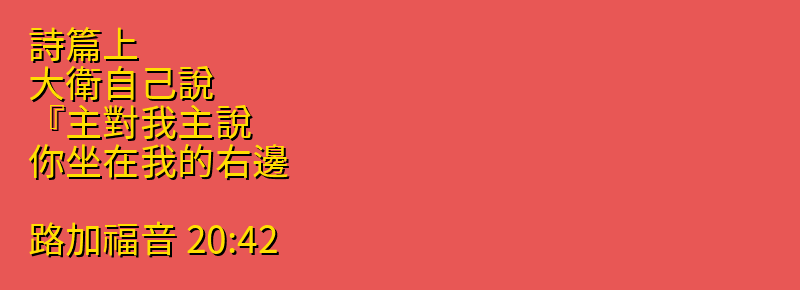 今日分享的中文聖經:「詩篇上、大衛自己說、『主對我主說、你坐在我的右邊、」來自聖經「路加福音」第「20章42節」,你可以繼續向下拉看到聖經卷書完整章節。每日中文聖經從神的話語中聆聽神的聲音,引導我們的人生,指導我們人生的方向,讓我們做出正確的選擇,而做出這些正確選擇的原則都在聖經中,所以我們需要讀神的話語,認識他的話語,把神的話語藏在心裡。