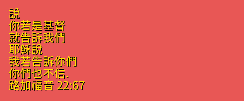 今日分享的中文聖經:「說、你若是基督、就告訴我們。耶穌說、我若告訴你們、你們也不信.」來自聖經「路加福音」第「22章67節」,你可以繼續向下拉看到聖經卷書完整章節。每日中文聖經從神的話語中聆聽神的聲音,引導我們的人生,指導我們人生的方向,讓我們做出正確的選擇,而做出這些正確選擇的原則都在聖經中,所以我們需要讀神的話語,認識他的話語,把神的話語藏在心裡。