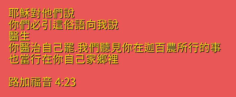 耶穌對他們說、你們必引這俗語向我說、醫生、你醫治自己罷.我們聽見你在迦百農所行的事、也當行在你自己家鄉裡。