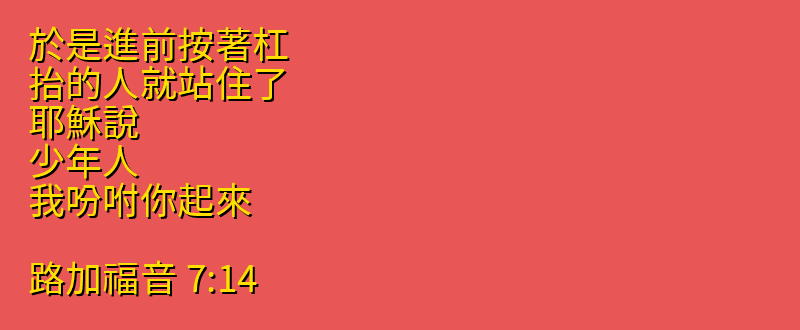 今日分享的中文聖經:「於是進前按著杠、抬的人就站住了。耶穌說、少年人、我吩咐你起來。」來自聖經「路加福音」第「7章14節」,你可以繼續向下拉看到聖經卷書完整章節。每日中文聖經從神的話語中聆聽神的聲音,引導我們的人生,指導我們人生的方向,讓我們做出正確的選擇,而做出這些正確選擇的原則都在聖經中,所以我們需要讀神的話語,認識他的話語,把神的話語藏在心裡。