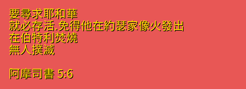 • 5:6 要尋求耶和華、就必存活.免得他在約瑟家像火發出、在伯特利焚燒、無人撲滅。