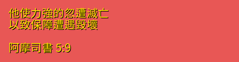 今日分享的中文聖經:「他使力強的忽遭滅亡、以致保障遭遇毀壞。」來自聖經「阿摩司書」第「5章9節」,你可以繼續向下拉看到聖經卷書完整章節。每日中文聖經從神的話語中聆聽神的聲音,引導我們的人生,指導我們人生的方向,讓我們做出正確的選擇,而做出這些正確選擇的原則都在聖經中,所以我們需要讀神的話語,認識他的話語,把神的話語藏在心裡。