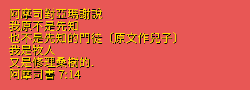 • 7:14 阿摩司對亞瑪謝說、我原不是先知、也不是先知的門徒〔原文作兒子〕我是牧人、又是修理桑樹的.