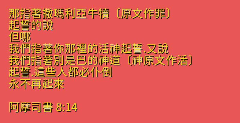 您對於阿摩司書聖經「那指著撒瑪利亞牛犢〔原文作罪〕起誓的說、但哪、我們指著你那裡的活神起誓.又說、我們指著別是巴的神道〔神原文作活〕起誓.這些人都必仆倒、永不再起來。」有何comment?