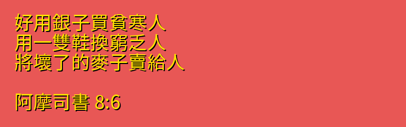 今日分享的中文聖經:「好用銀子買貧寒人、用一雙鞋換窮乏人、將壞了的麥子賣給人。」來自聖經「阿摩司書」第「8章6節」,你可以繼續向下拉看到聖經卷書完整章節。每日中文聖經從神的話語中聆聽神的聲音,引導我們的人生,指導我們人生的方向,讓我們做出正確的選擇,而做出這些正確選擇的原則都在聖經中,所以我們需要讀神的話語,認識他的話語,把神的話語藏在心裡。
