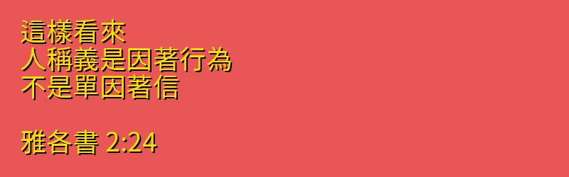 今日分享的中文聖經:「這樣看來、人稱義是因著行為、不是單因著信。」來自聖經「雅各書」第「2章24節」,你可以繼續向下拉看到聖經卷書完整章節。每日中文聖經從神的話語中聆聽神的聲音,引導我們的人生,指導我們人生的方向,讓我們做出正確的選擇,而做出這些正確選擇的原則都在聖經中,所以我們需要讀神的話語,認識他的話語,把神的話語藏在心裡。