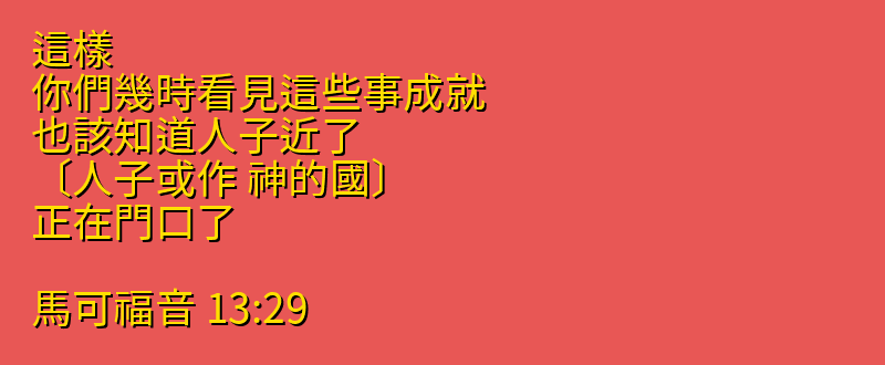 今日分享的中文聖經:「這樣、你們幾時看見這些事成就、也該知道人子近了、〔人子或作 神的國〕正在門口了。」來自聖經「馬可福音」第「13章29節」,你可以繼續向下拉看到聖經卷書完整章節。每日中文聖經從神的話語中聆聽神的聲音,引導我們的人生,指導我們人生的方向,讓我們做出正確的選擇,而做出這些正確選擇的原則都在聖經中,所以我們需要讀神的話語,認識他的話語,把神的話語藏在心裡。