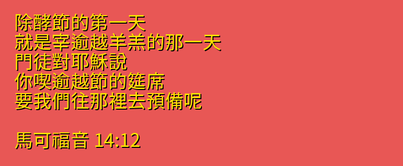 除酵節的第一天、就是宰逾越羊羔的那一天、門徒對耶穌說、你喫逾越節的筵席、要我們往那裡去預備呢。