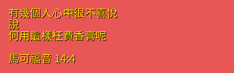 有幾個人心中很不喜悅、說、何用這樣枉費香膏呢。