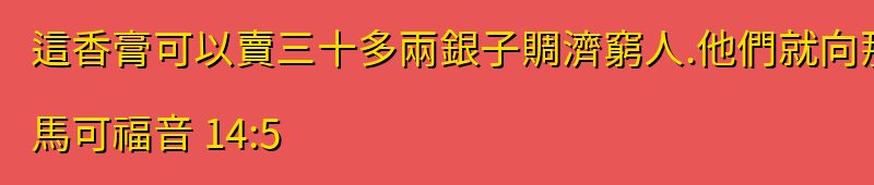 今日分享的中文聖經:「這香膏可以賣三十多兩銀子賙濟窮人.他們就向那女人生氣。」來自聖經「馬可福音」第「14章5節」,你可以繼續向下拉看到聖經卷書完整章節。每日中文聖經從神的話語中聆聽神的聲音,引導我們的人生,指導我們人生的方向,讓我們做出正確的選擇,而做出這些正確選擇的原則都在聖經中,所以我們需要讀神的話語,認識他的話語,把神的話語藏在心裡。