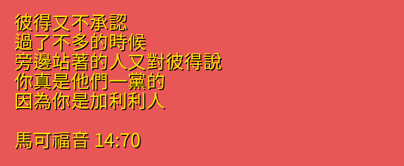 彼得又不承認。過了不多的時候、旁邊站著的人又對彼得說、你真是他們一黨的。因為你是加利利人。