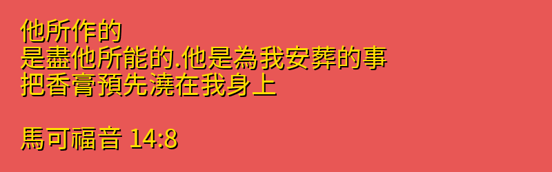 今日分享的中文聖經:「他所作的、是盡他所能的.他是為我安葬的事、把香膏預先澆在我身上。」來自聖經「馬可福音」第「14章8節」,你可以繼續向下拉看到聖經卷書完整章節。每日中文聖經從神的話語中聆聽神的聲音,引導我們的人生,指導我們人生的方向,讓我們做出正確的選擇,而做出這些正確選擇的原則都在聖經中,所以我們需要讀神的話語,認識他的話語,把神的話語藏在心裡。