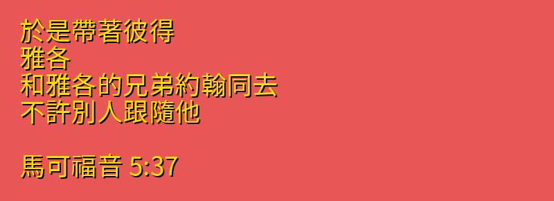 今日分享的中文聖經:「於是帶著彼得、雅各、和雅各的兄弟約翰同去、不許別人跟隨他。」來自聖經「馬可福音」第「5章37節」,你可以繼續向下拉看到聖經卷書完整章節。每日中文聖經從神的話語中聆聽神的聲音,引導我們的人生,指導我們人生的方向,讓我們做出正確的選擇,而做出這些正確選擇的原則都在聖經中,所以我們需要讀神的話語,認識他的話語,把神的話語藏在心裡。