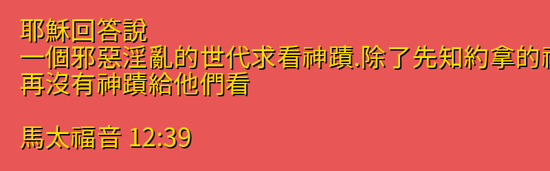 耶穌回答說、一個邪惡淫亂的世代求看神蹟.除了先知約拿的神蹟以外、再沒有神蹟給他們看。