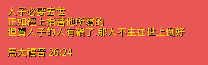 • 26:24 人子必要去世、正如經上指著他所寫的、但賣人子的人有禍了.那人不生在世上倒好。