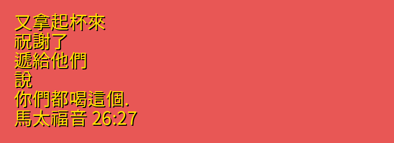 今日分享的中文聖經:「又拿起杯來、祝謝了、遞給他們、說、你們都喝這個.」來自聖經「馬太福音」第「26章27節」,你可以繼續向下拉看到聖經卷書完整章節。每日中文聖經從神的話語中聆聽神的聲音,引導我們的人生,指導我們人生的方向,讓我們做出正確的選擇,而做出這些正確選擇的原則都在聖經中,所以我們需要讀神的話語,認識他的話語,把神的話語藏在心裡。