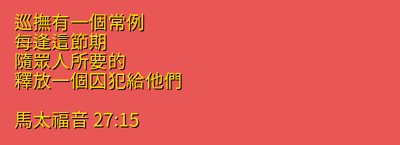 今日分享的中文聖經:「巡撫有一個常例、每逢這節期、隨眾人所要的、釋放一個囚犯給他們。」來自聖經「馬太福音」第「27章15節」,你可以繼續向下拉看到聖經卷書完整章節。每日中文聖經從神的話語中聆聽神的聲音,引導我們的人生,指導我們人生的方向,讓我們做出正確的選擇,而做出這些正確選擇的原則都在聖經中,所以我們需要讀神的話語,認識他的話語,把神的話語藏在心裡。