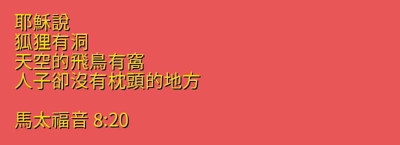 耶穌說、狐狸有洞、天空的飛鳥有窩、人子卻沒有枕頭的地方。