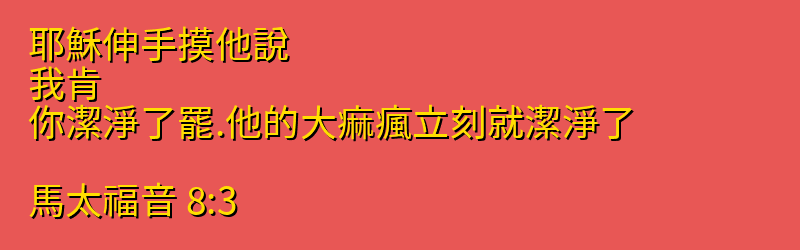 耶穌伸手摸他說、我肯、你潔淨了罷.他的大痲瘋立刻就潔淨了。